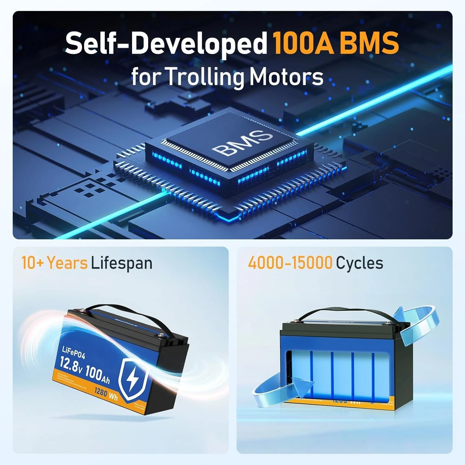1280Wh Energy Output: The 12V 100Ah LiFePO4 battery has a maximum output power of 1280Wh, which is 2 to 3 times that of an SLA battery of the same size. The maximum continuous discharge current is 100A, capable of powering most electrical devices