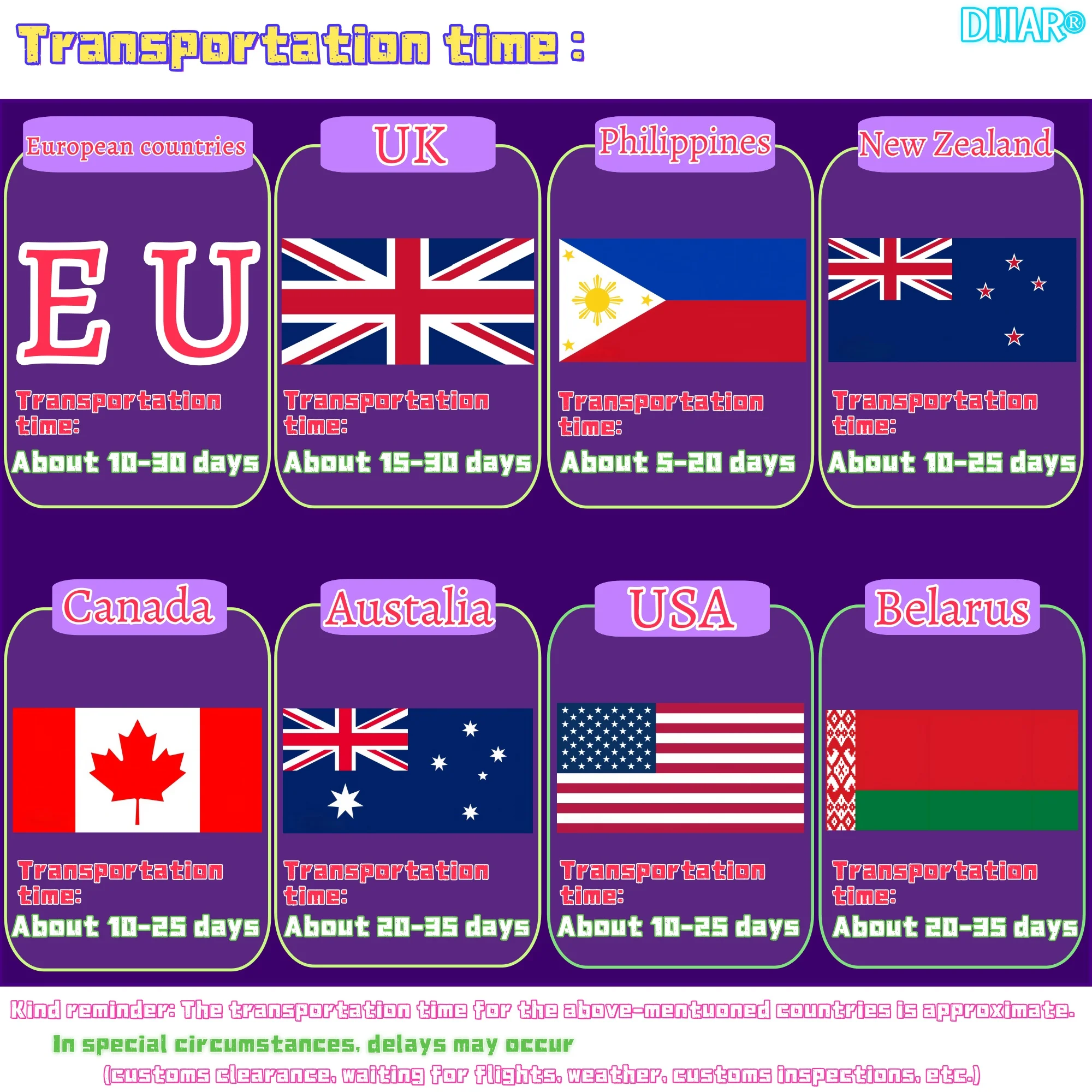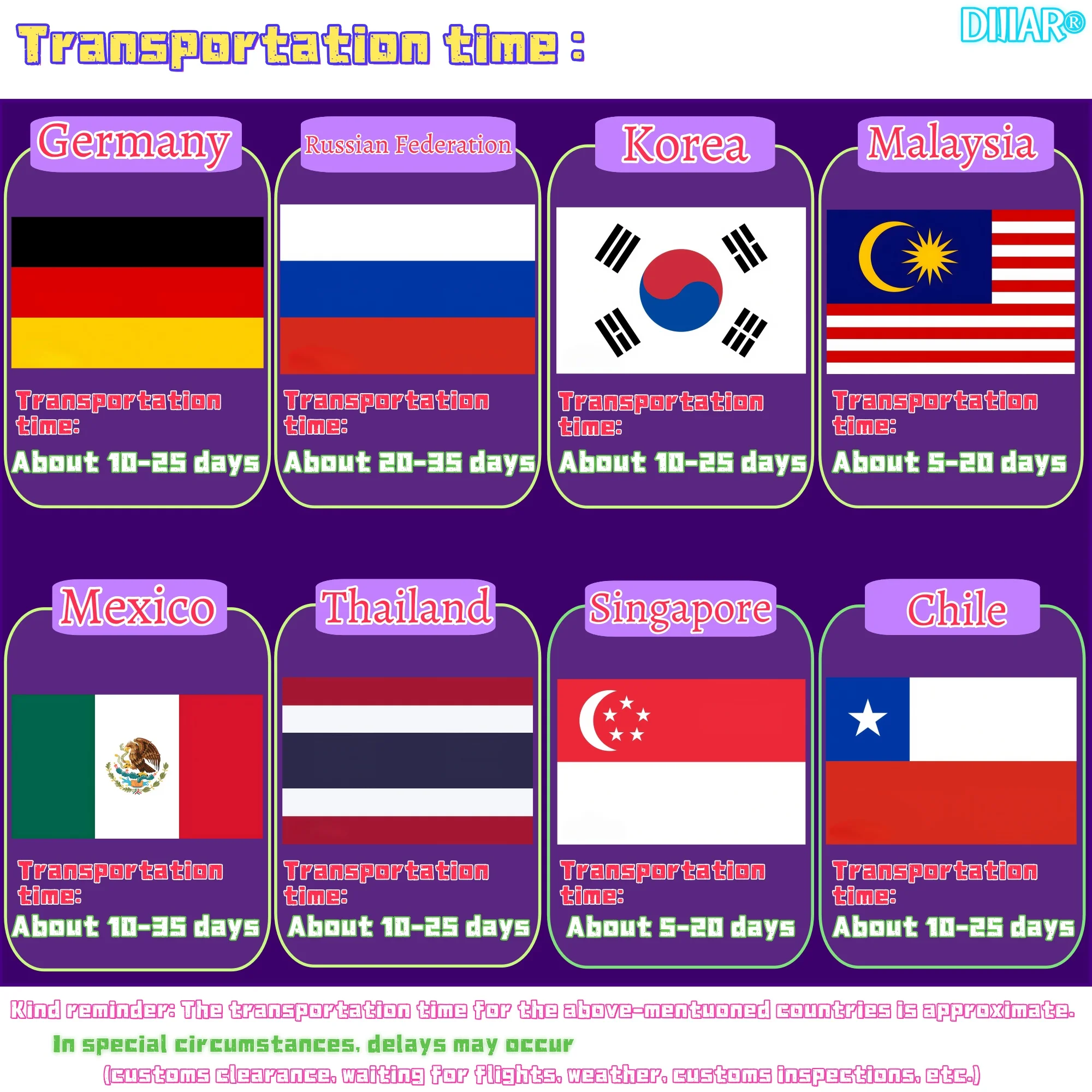Kind reminder: The transportation time for the above-mentioned countries is approximate. In special circumstances, delays may occur (customs clearance, waiting for flights, weather, customs inspections, etc.)