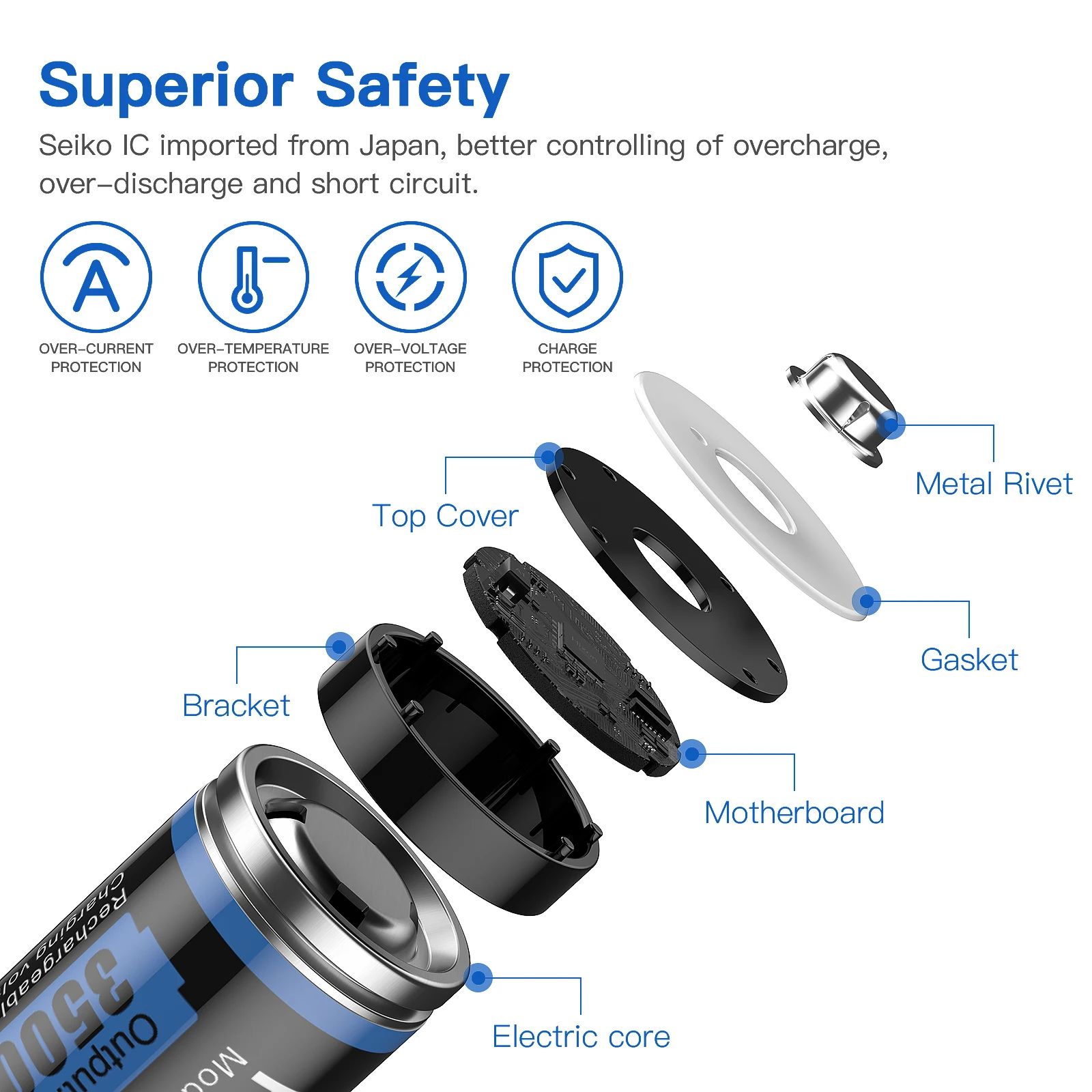 3500mWh, Built-in AA Integrated safety circuit, protects battery from over discharge & overcharge. Suitable for all kinds of high-power demand electrical device, including smart home devices, outdoor surveillance systems, wireless cameras, insulin pump, XBox controller, toys, remote controls, and portable audio players
