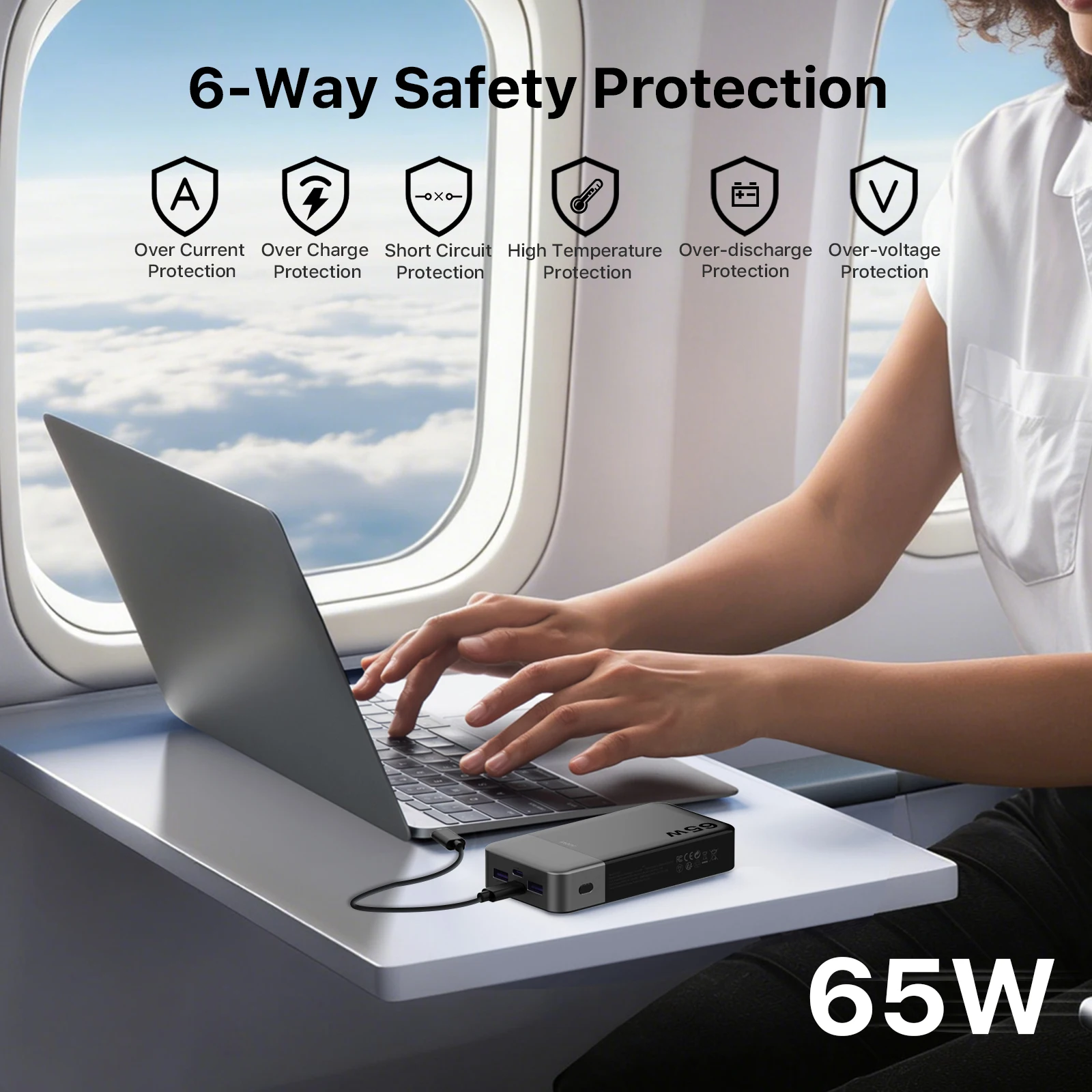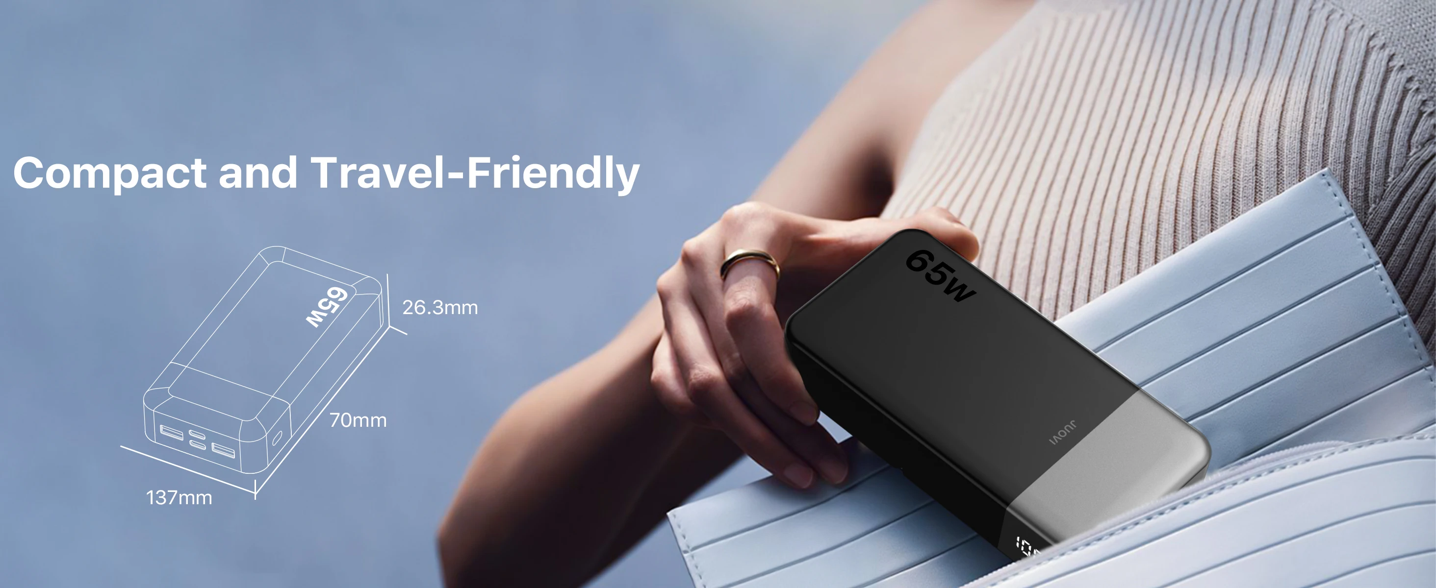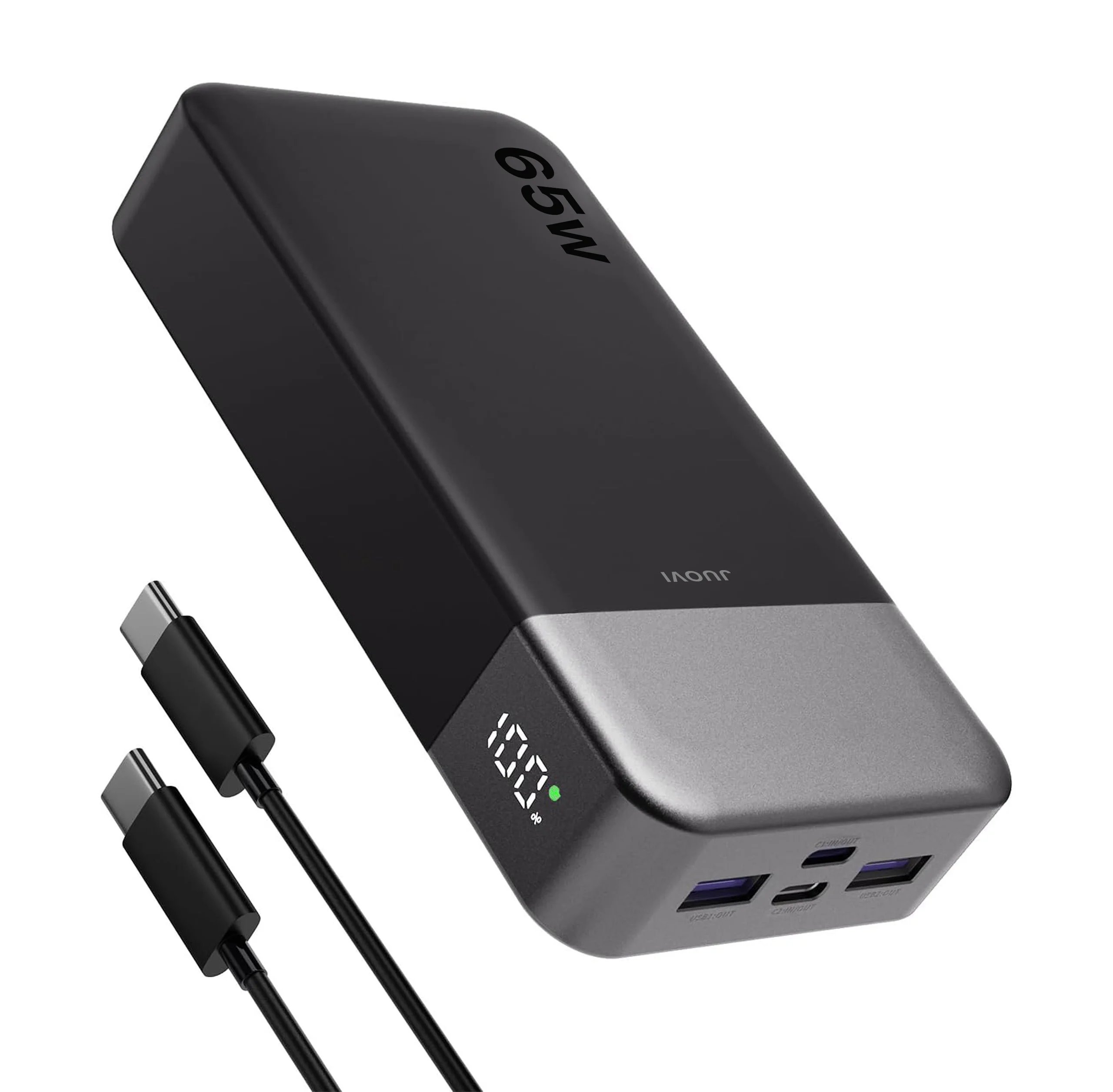 • Safety Protection & Package Contents: Engineered with a multi-protection system that actively guards against overcharging, overheating, short-circuit, and overcurrent. An integrated intelligent chip monitors voltage and current in real time, automatically adjusting output to ensure safe operation. Package Includes: 1 × JUOVI 65W 20000mAh Power Bank, 1 × USB-C to USB-C Cable (1 ft), 1 × User Manual.