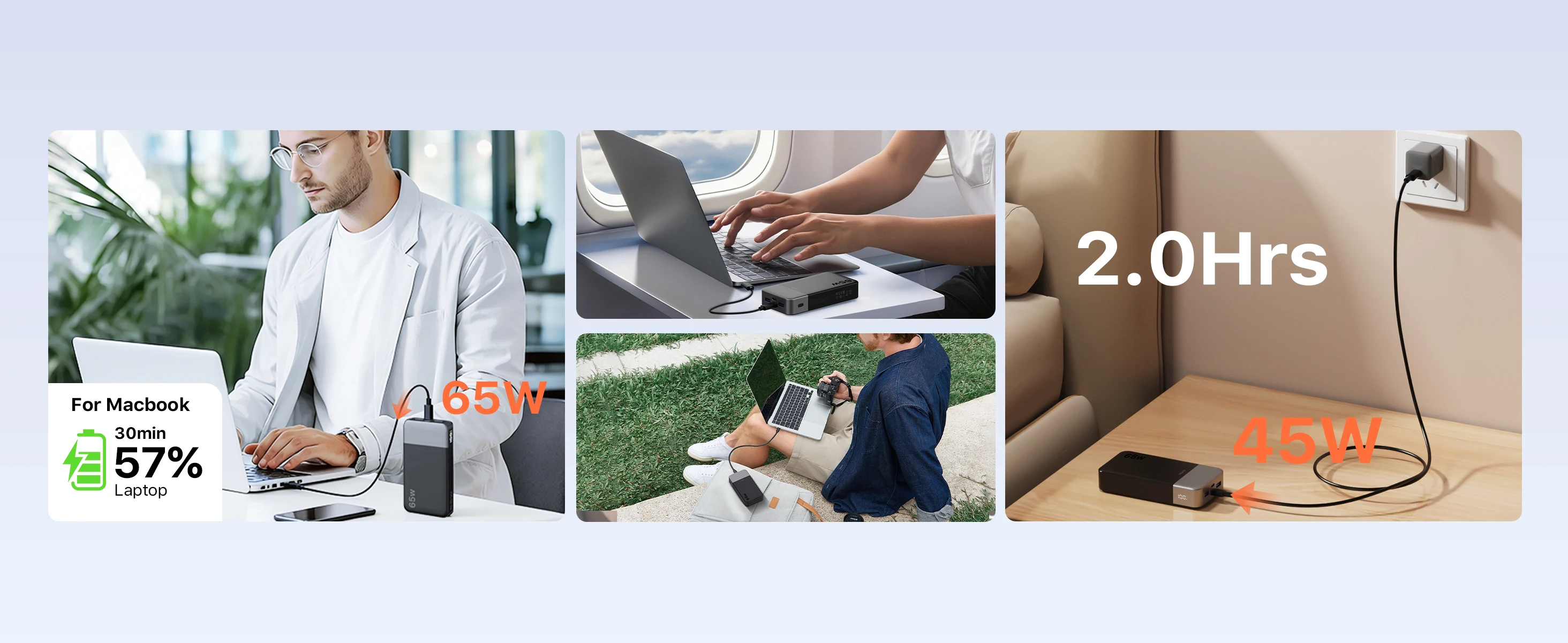 • 65W High-Speed Laptop Charging & PD 3.0 Fast Charging: This power bank delivers a full 65W of PD 3.0 fast charging through its dual USB-C ports. It delivers high-speed charging to compatible laptops, such as recharging a 14″ MacBook Pro to 50% in approximately 40 minutes, an iphone to 60% In just 30 minutes, With reliable power for your laptop, tablet, and phone during travel, remote work, or daily use, it provides a versatile charging solution for professionals, students, and frequent commuters.